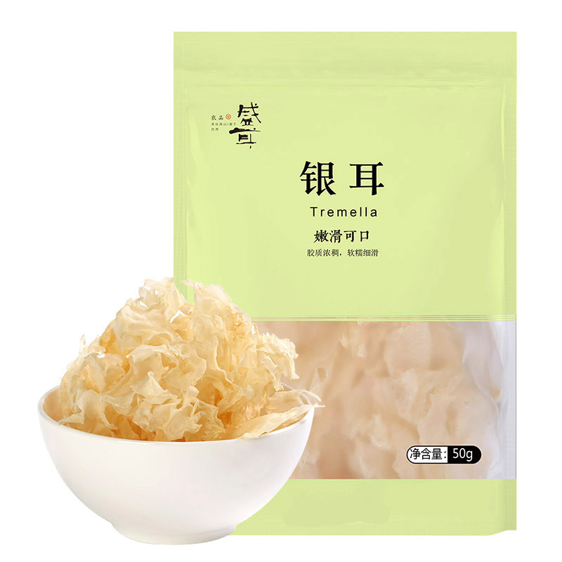 銀耳的食用價值就不言而喻了,通江銀耳如此名貴稀缺,也是國家地理標志產(chǎn)品之一,對銀耳產(chǎn)品的挖掘和包裝,也是很多商人盯上的一個市場。小編認為,既然要做銀耳市場,那就要選擇通江銀耳,并且是半野生培育的青岡樹銀耳,用最優(yōu)質(zhì)的產(chǎn)品,加上好的品牌定位,好的產(chǎn)品包裝,一定會如虎添翼。以下是淘寶里面銷量好的銀耳包裝效果圖:
